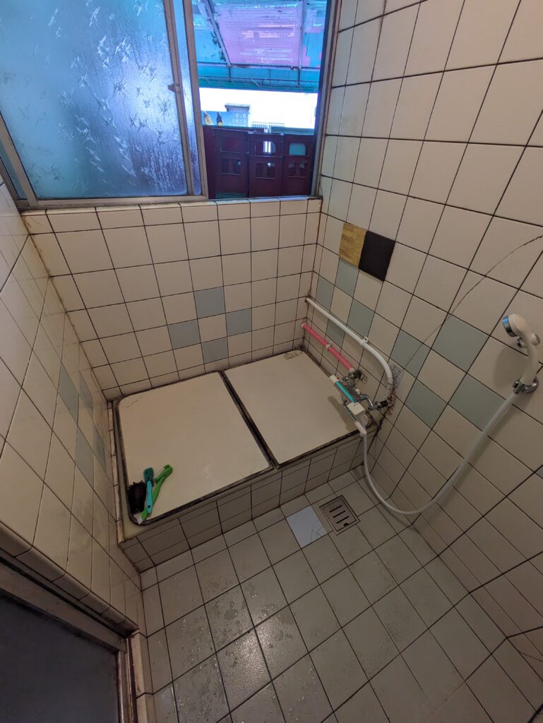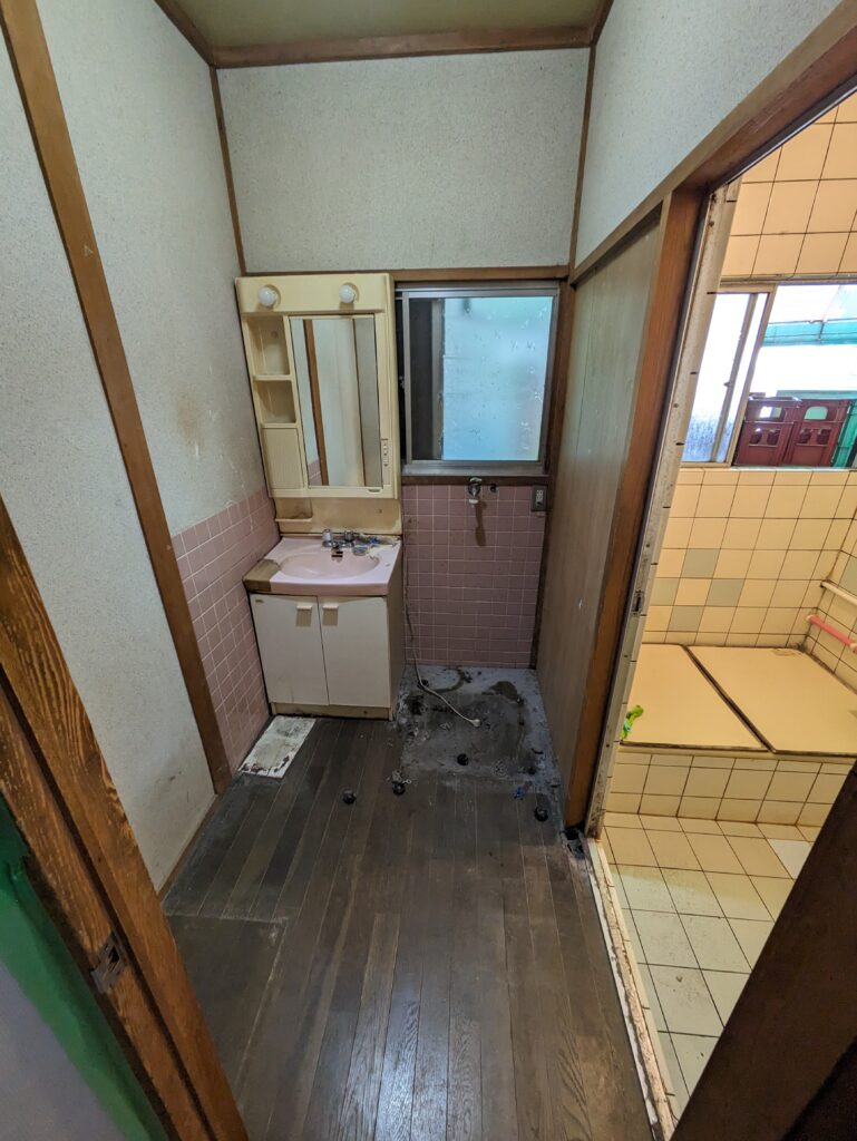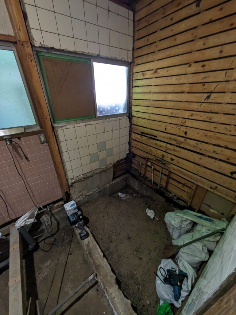浴室は浴槽や壁のタイル等を、洗面所側は床下地から洗面化粧台を解体していきます。