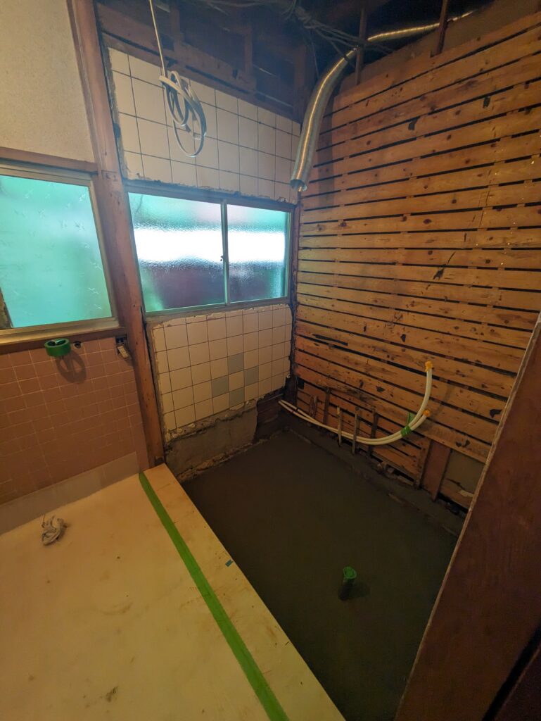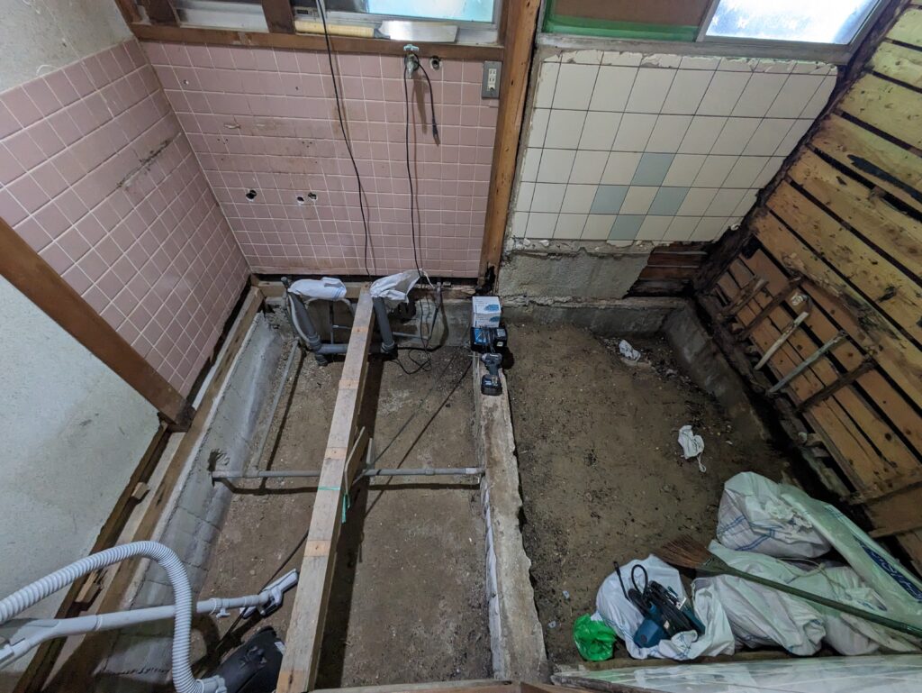 こちらが、浴室側は給排水管・電気配線やダクト管の設置、土間コン打設、洗面所側の床下地を行った写真になります。